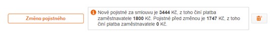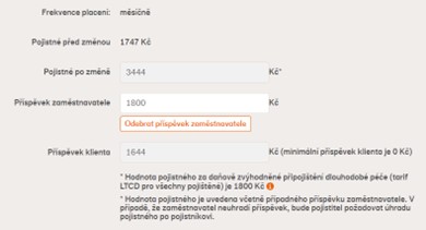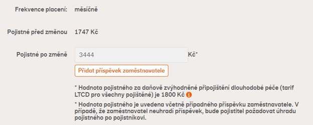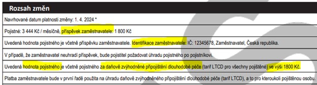 Příspěvek zaměstnavatele a výše pojistného za LTCD se zobrazí na žádosti o změně (viz. žlutě zvýrazněné na obrázku níže).