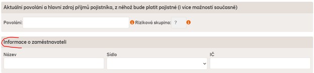 U Doplňujících údajů nově můžete vyplnit informace o zaměstnavateli. Jsou umístěné pod povoláním a zdroji příjmů pojistníka. Tyto informace je potřeba vyplnit vždy, když klient využívá příspěvek zaměstnavatele.
