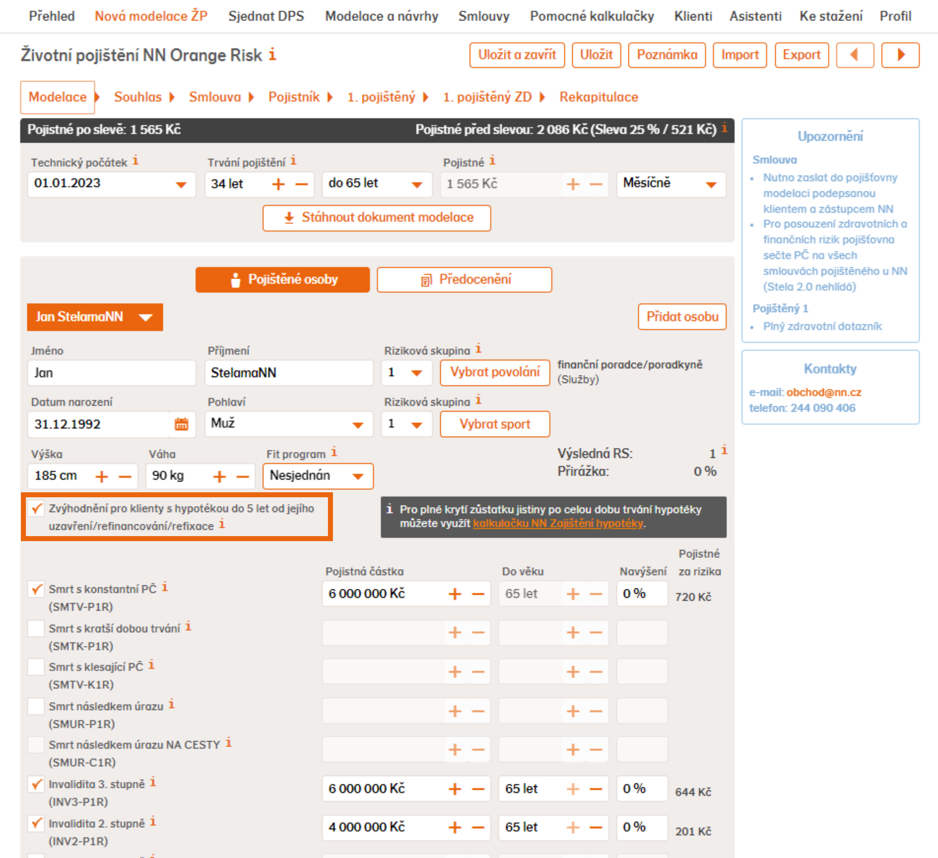 Pro uplatnění stačí v kalkulačce Stela 2.0 zakliknout „Zvýhodnění pro klienty s hypotékou“, anebo využít přímo pomocnou kalkulačku NN Zajištění hypotéky.